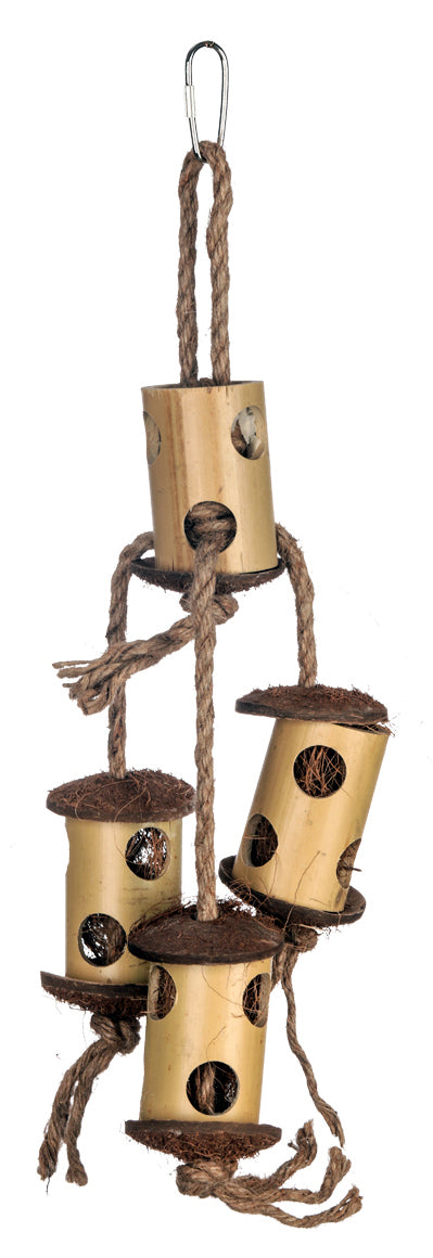 This foraging toy design consists of bamboo tubes with coconut shell caps strung on natural jute rope. The bamboo tubes are drilled with foraging holes and stuffed with coconut fibers. Attaches to the cage with a bird-safe pear link.