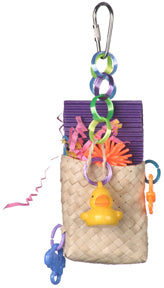 Adorable mini woven palm tote bag adorned with plastic curly Qs, corrugated paper, plastic animal charms, crinkle shred, a rubber duckie and porcupine beach ball.