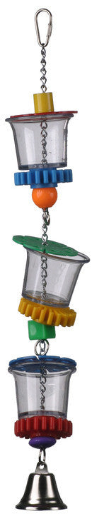 Our Bottoms Up toy with its three clear acrylic cups will display your parrots favorite treats making it a great foraging starter toy.