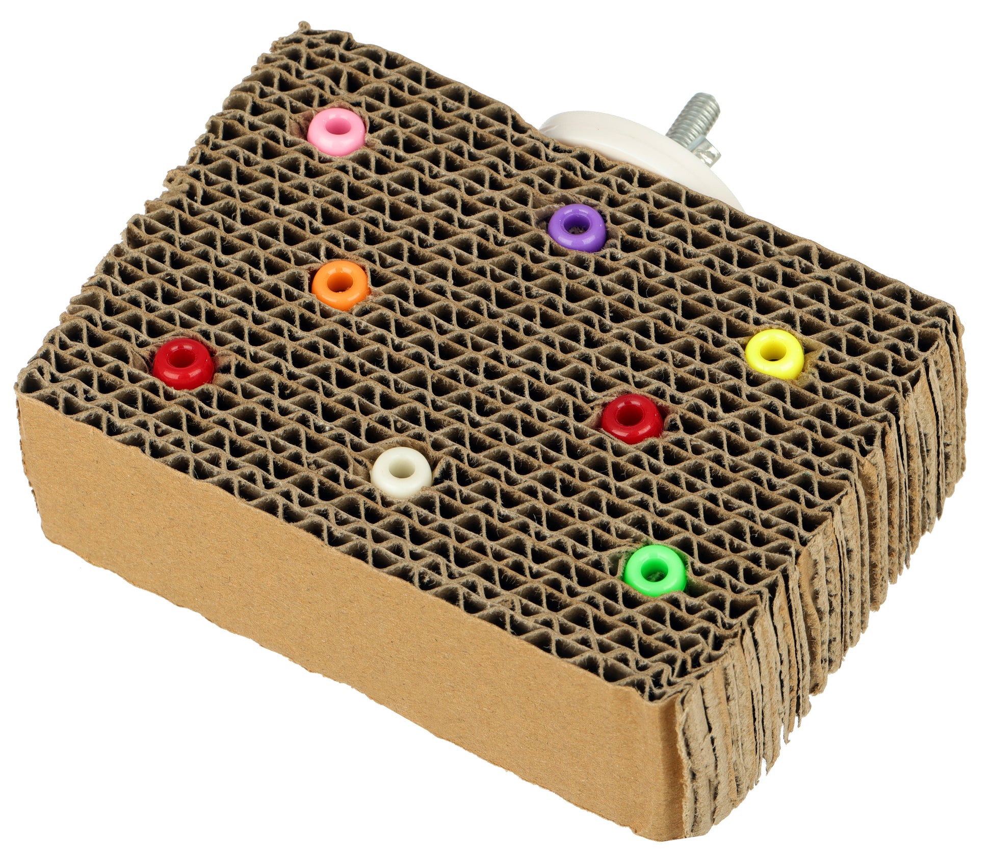 Thick, layered cardboard block embedded with plastic beads and designed to entice chewing and foraging activity. Bolts to the side of the cage.