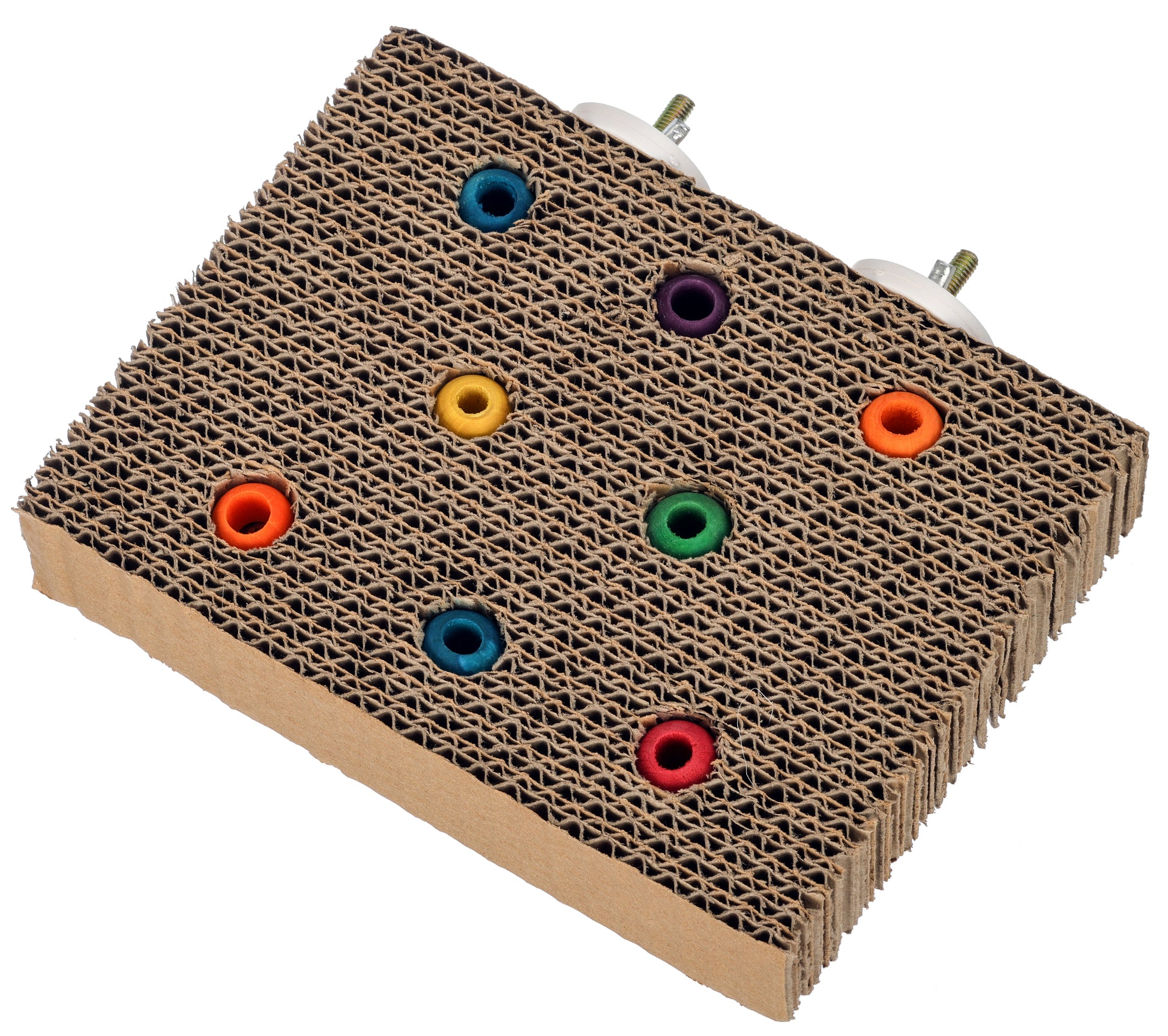 Thick, layered cardboard block embedded with wooden beads and designed to entice chewing and foraging activity. Bolts to the side of the cage.
