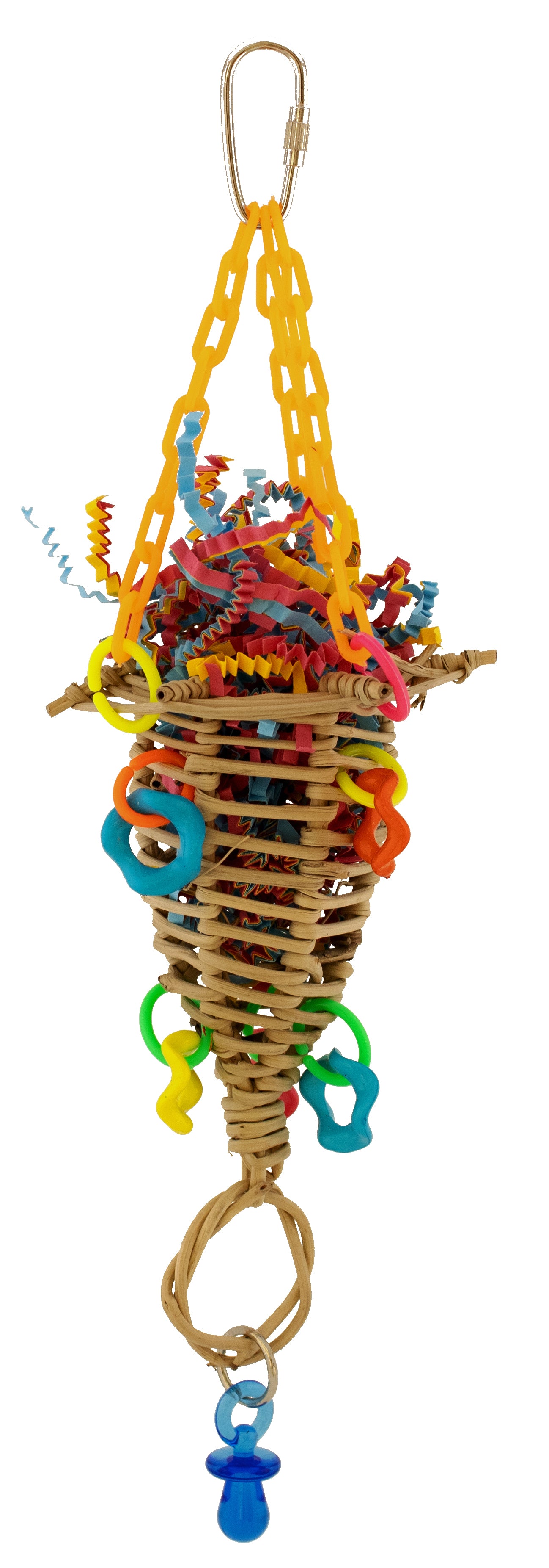 Consists of vine woven into a cone shape that has been filled with colorful crinkle shred and adorned with fun-to-beak beads and pacifiers. Attaches to the cage with a bird-safe pear link.