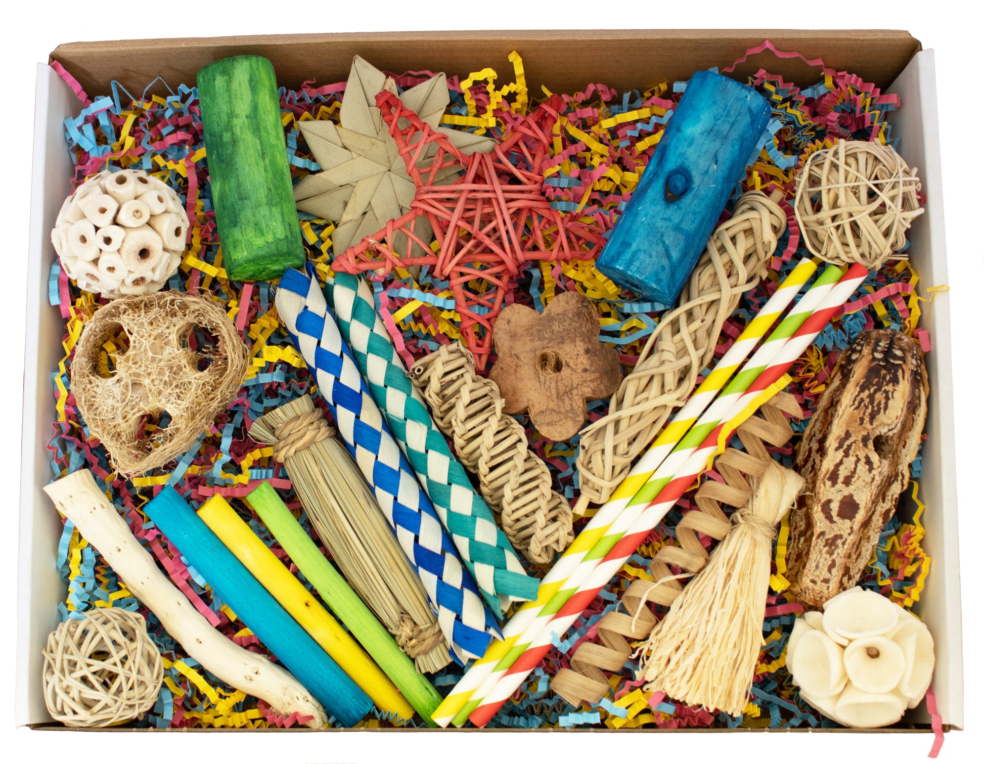 Includes over 30 toy parts in 20 different materials for birds to explore and enjoy including vine shapes, jute sticks, sola balls, palm flowers, sola stems, coconut slices, mahogany pods, and much more. Utilizing a diverse selection of stimulating materials, colors, textures, and shapes make Super Bird Creations toys of maximum interest to pet birds.