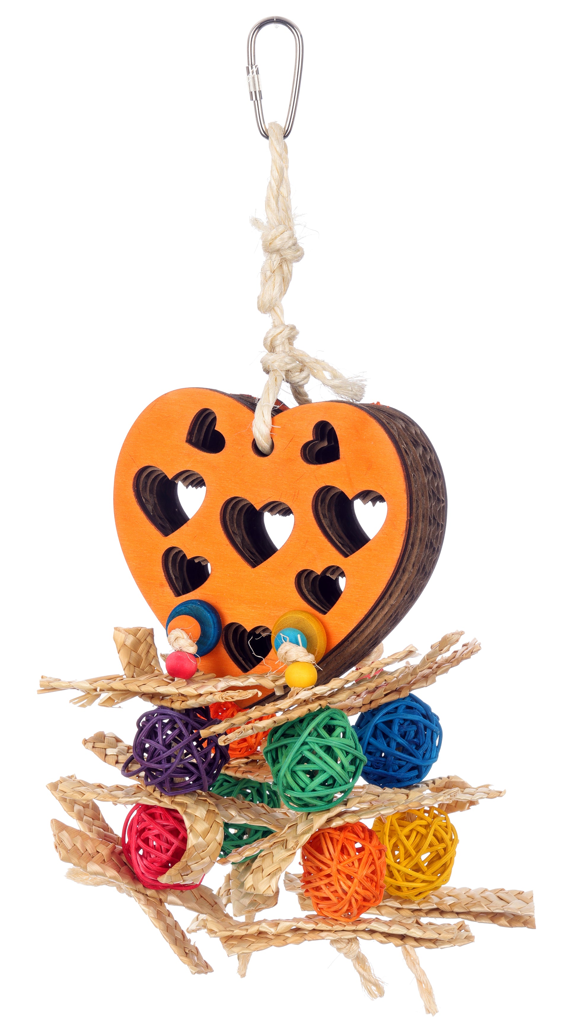 Adorable heart-shaped core consisting of cardboard sandwiched between two wooden outer layers with several heart-shaped cutouts perfect for inserting treats. The heart is adorned with colorful vine balls and woven palm strips to delight chewers. Easily attaches to the cage with a bird-safe pear link.