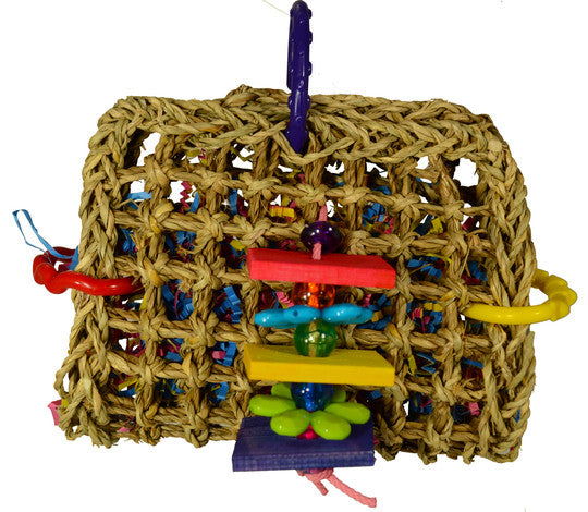 A foraging must have for your smaller birds. This mini seagrass pouch is filled with colorful paper shred with plenty of room for you to add your birds favorite treats. Decorated with flower beads, wooden slats, plastic beads, and colorful paulie rope. Munch time, anyone?