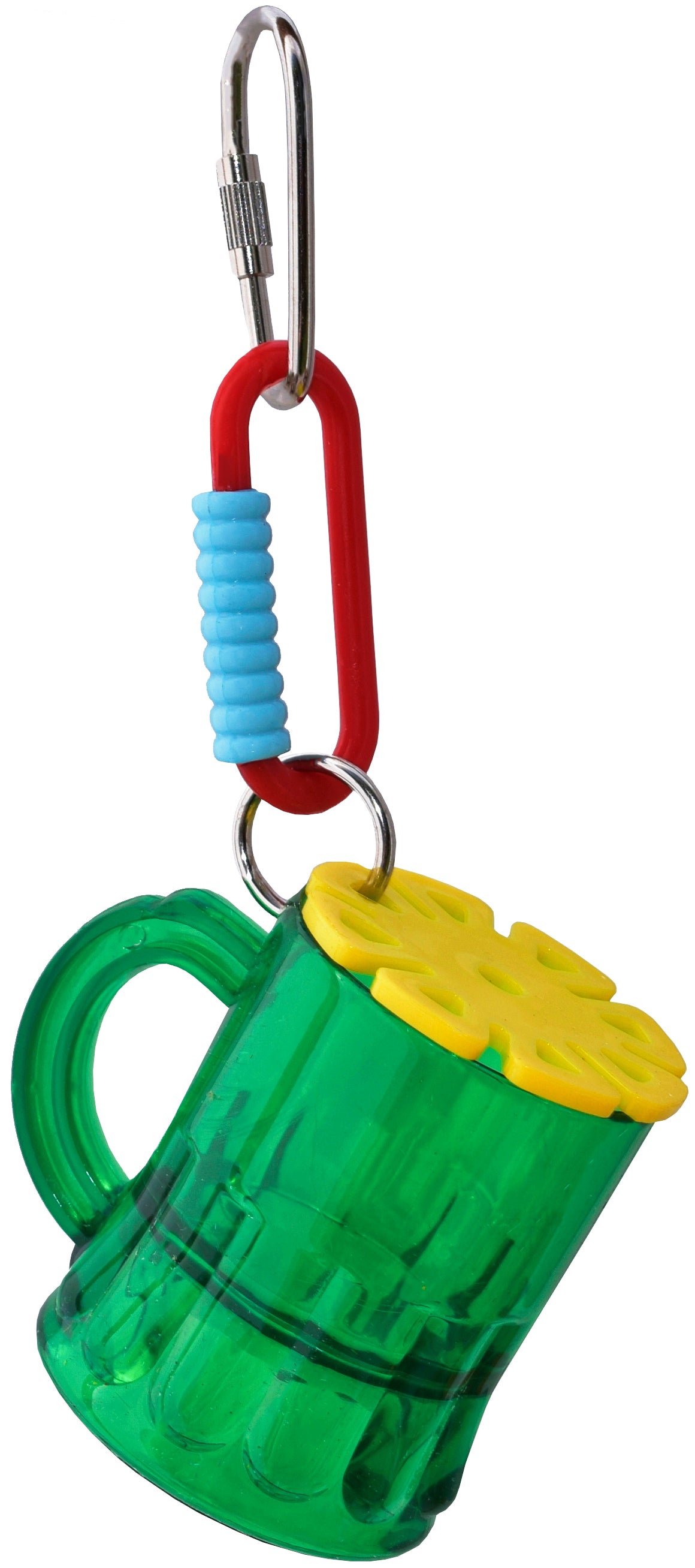 A tantalizing translucent lidded mug dangles from a sturdy plastic link. Make sure to fill the cup with your bird's favorite treats to encourage foraging. Great starter foraging toy for small birds.