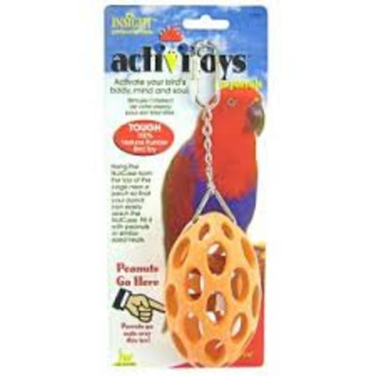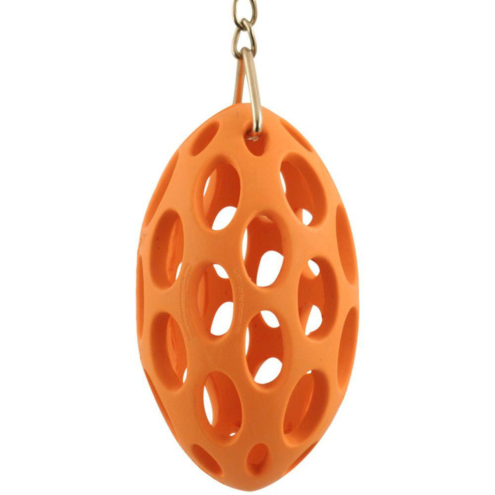 The Nutcase Activitoy is a stretchy all natural rubber football shaped toy that hangs from a chain inside the cage. This soft flexible rubber is tough and can be stretched and filled with your birds favorite nuts or treats. The small cut outs in the rubber allow your bird to hold it and to manipulate the toy to remove the treats inside. This toy is both intellectually and physically challenging to your bird. Great for parrots of all sizes.